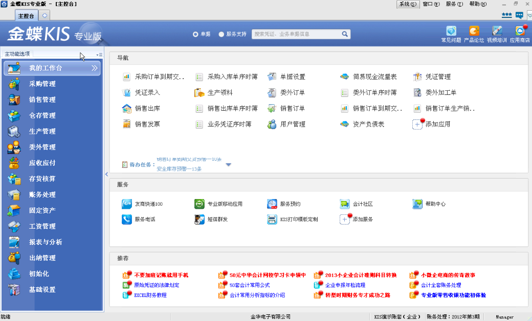 金蝶KIS專(zhuān)業(yè)版以“讓生產(chǎn)企業(yè)管理更簡(jiǎn)單”為核心理念,軟件功能全面覆蓋中小型企業(yè)管理的五大關(guān)鍵環(huán)節(jié):采購(gòu)管理、銷(xiāo)售管理、生產(chǎn)管理、倉(cāng)存管理、財(cái)務(wù)管理,以豐富的報(bào)表為企業(yè)管理者提供實(shí)時(shí)查詢和決策依據(jù);在將財(cái)務(wù)、業(yè)務(wù)進(jìn)行一體化管理的同時(shí),突破局域網(wǎng)應(yīng)用模式,整合基于云+端新型服務(wù)模式的云管理平臺(tái),豐富的應(yīng)用將最大化地滿足企業(yè)的個(gè)性化需求。