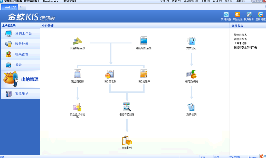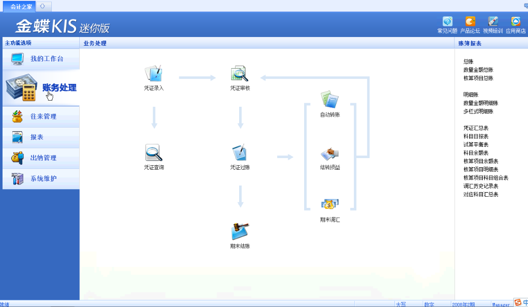 務(wù)處理是KIS迷你版的核心模塊,主要包括憑證處理、賬簿、期末處理等。