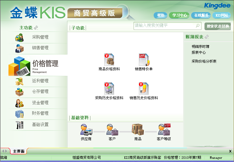 金蝶KIS商貿(mào)高級版幫助企業(yè)高效經(jīng)營商品、理清資金,管理客戶、供應(yīng)商、價(jià)格等信息,實(shí)現(xiàn)財(cái)務(wù)業(yè)務(wù)一體化管理。同時(shí),進(jìn)行商業(yè)數(shù)據(jù)安全保護(hù)、自動生成商品補(bǔ)貨計(jì)劃、簡單的核算提成與返利計(jì)算以及全面的價(jià)格管理,讓管理逐步精細(xì)化。